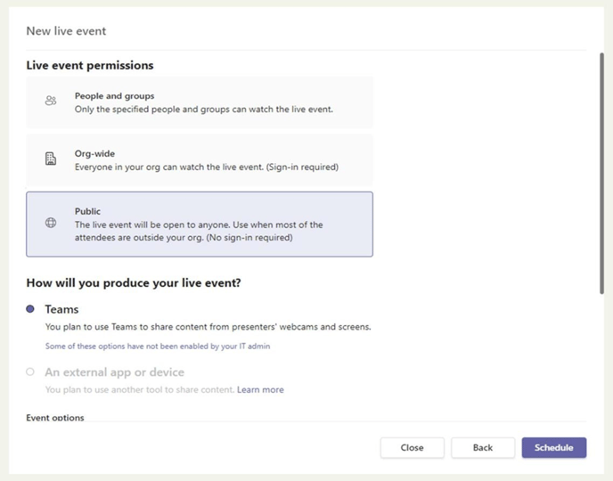 - While creating the live event, select "Public" in "Live event permission" if you don't want the user to log in with their Microsoft account on the media player.